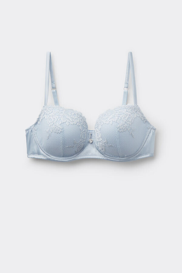 Sofia Balconette-BH mit Cups aus Stretch-Seidensatin und verziert mit raffinierter Stretch-Spitze mit Blumenstickerei und einem eleganten Unterband aus Stretch-Seidensatin mit einem hübschen herzförmigen Anhänger mit Strasssteinen in der Mitte. Dieser BH formt auf natürliche Weise und bietet maximalen Komfort. Er eignet sich perfekt, um ihn unter einem Ausschnitt oder einem durchsichtigen Oberteil zu tragen.