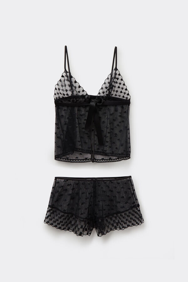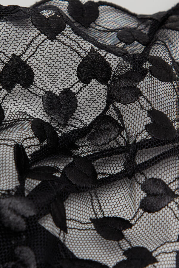 Verspieltes Set aus romantischem Tüll mit Herzmuster, verziert mit sinnlichen Satinborten und Tüll mit Herzstickerei. Der Satinriemen ist abnehmbar und kann auch als verspielter Halsreif oder Haarschmuck verwendet werden.
