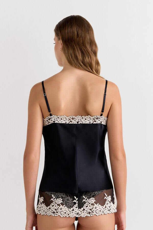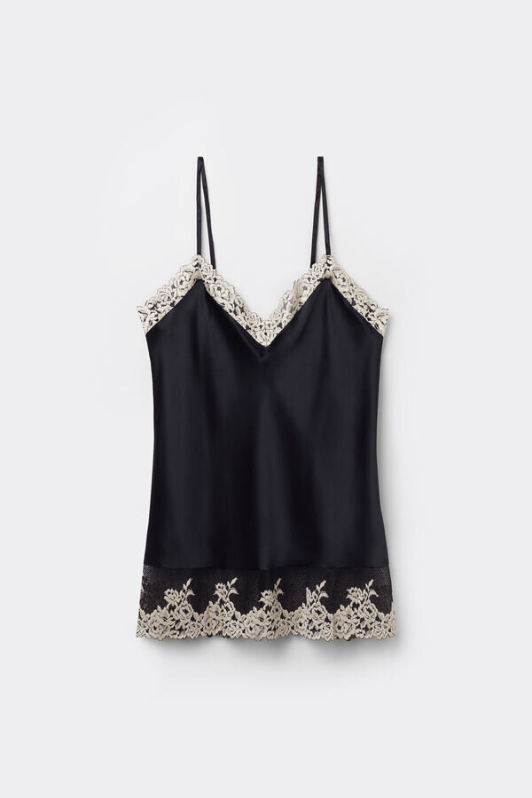 Seidensatin-Tanktop mit V-Ausschnitt vorne und hinten, verziert mit Spitzeneinsätzen am Ausschnitt und am Saum. Je nach gewählter Farbe kann die Spitze kontrastfarben oder ton-in-ton sein. Vollständig verstellbare, dünne Seiden Träger. Reguläre Passform.