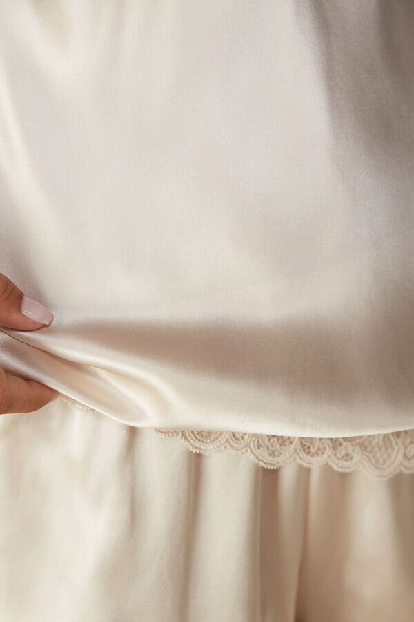Seidentop mit V-Ausschnitt und verstellbaren Spaghettiträgern, verziert mit Spitzendetails am Ausschnitt und am Saum. Perfekt als Dessous und unter einer Jacke. Das Model ist 1,75 m groß und trägt Größe S.
