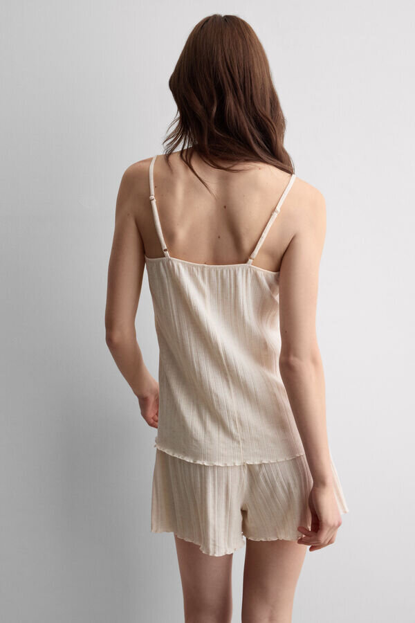 Kurzer Pyjama aus weicher Modal-Baumwolle mit Pointelle-Muster und Wellenkante. Drei Knöpfe an Oberteil und Shorts.
