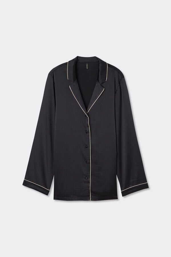 Leichte Stretch-Seidensatinjacke im Herrenstil mit Ton-in-Ton- oder kontrastfarbenen Verzierungen, je nach gewählter Farbe. Elegant und bequem, eignet sie sich perfekt für ein raffiniertes Abendoutfit, kann aber auch als Oberbekleidung zu Hosen oder Jeans getragen werden.