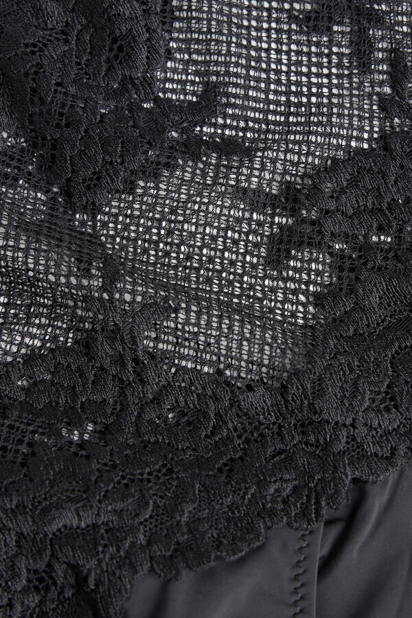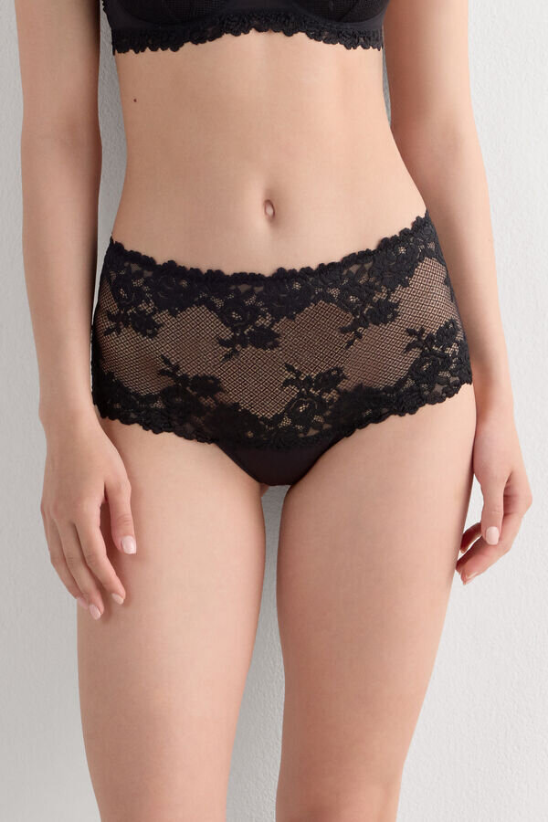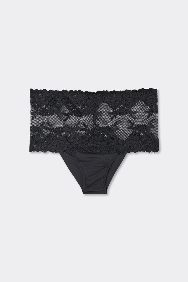 Hoch geschnittener Hipster-Brazilian aus Spitzenrüschen mit weichem Mikrofaser-Unterteil. Je nach gewählter Farbe kann die Spitze kontrastfarben oder ton-in-ton sein. Hoch geschnittene Seiten. Innenzwickel aus 100 % Baumwolle.