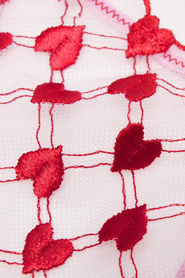 Thong aus romantischem Tüll mit Herzstickerei und sinnlichem Satinbesatz. Der Satinriemen ist abnehmbar und kann auch als verspielter Halsreif oder Haarschmuck verwendet werden.