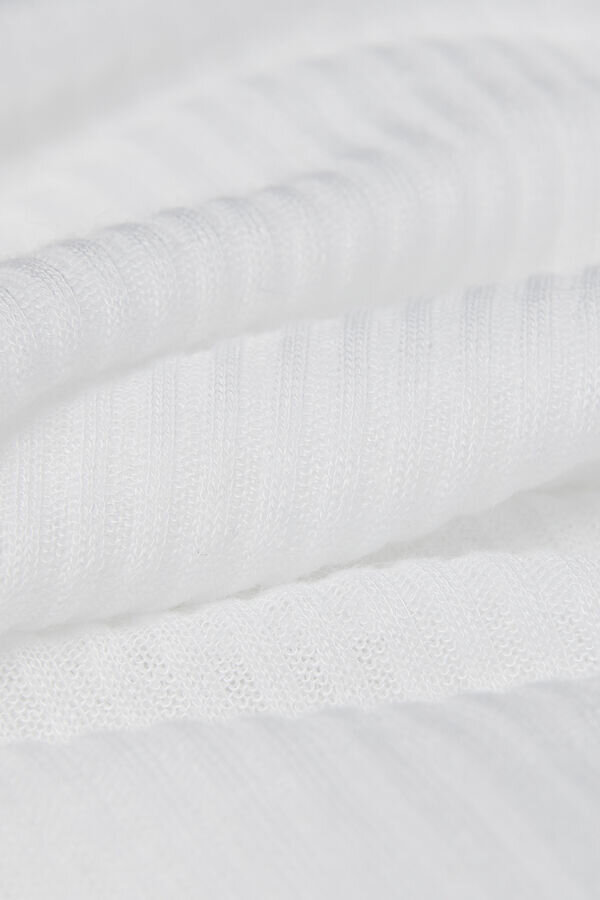 Schlank geschnittenes Oberteil aus weicher, gerippter Modal-Kaschmir-Mischung. Dank seiner sinnlichen Transparenz und seiner fließenden, drapierten Passform kann es allein oder unter einer Jacke getragen werden. Für alle, die leicht frieren, ist es ein bequemes Oberteil zum Unterziehen.