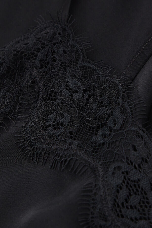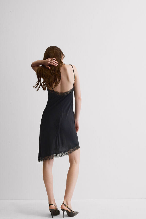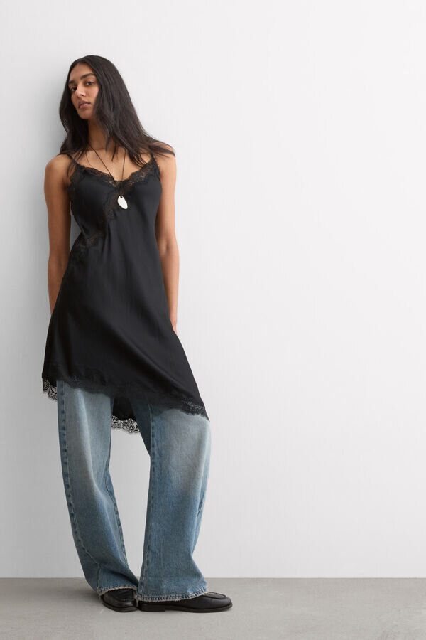 Asymmetrischer Slip aus Viskosesatin mit Spitzeneinsätzen und -besatz. Ideal auch als Kleid für einen noch glamouröseren Stil.