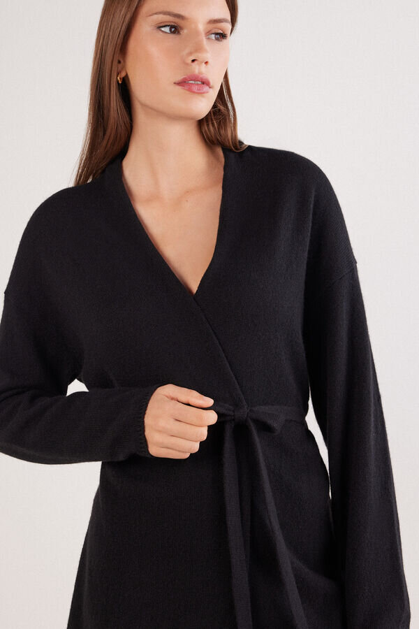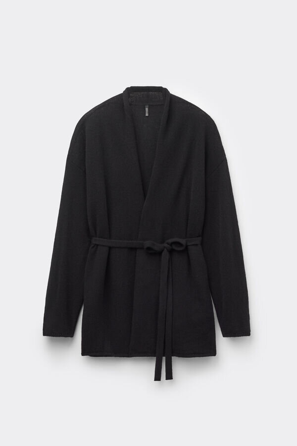 Strickjacke aus reinem Kaschmir mit weicher Textur und bequemer, kuscheliger Passform. Dank des Gürtels sehr vielseitig und auf verschiedene Arten tragbar. Kann auch als warmer, kuscheliger Morgenmantel verwendet werden.