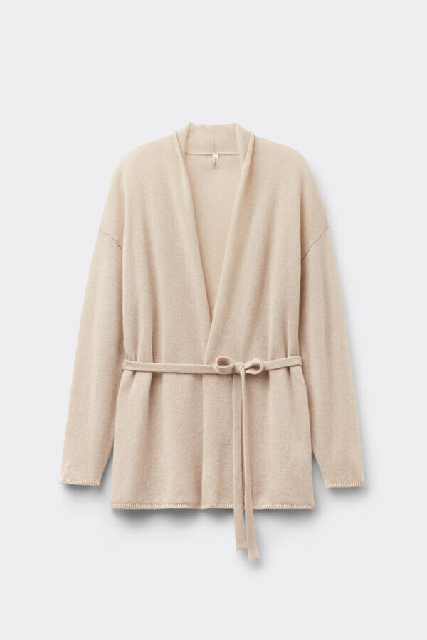 Strickjacke aus reinem Kaschmir mit weicher Textur und bequemer, kuscheliger Passform. Dank des Gürtels sehr vielseitig und auf verschiedene Arten tragbar. Kann auch als warmer, kuscheliger Morgenmantel verwendet werden.