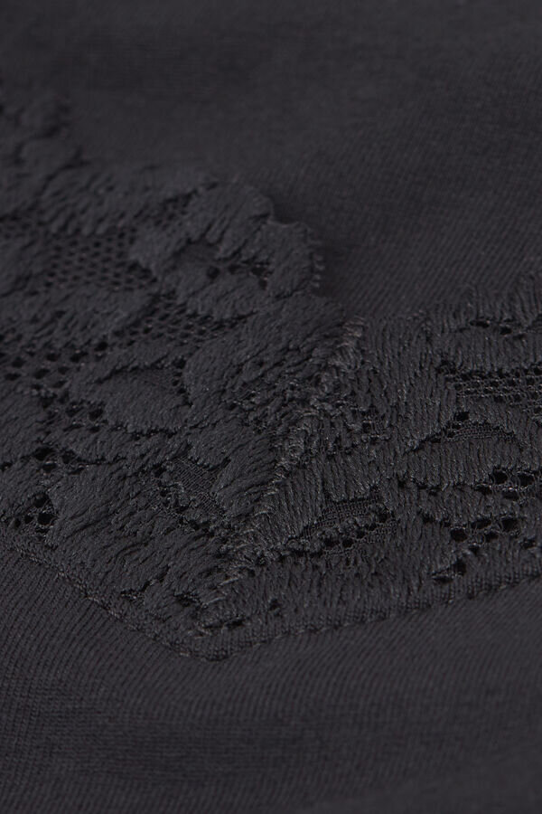 Top mit V-Ausschnitt aus Modal und verziert mit einer Spitzenrüsche. Je nach gewählter Farbe kann die Spitze kontrastfarben oder ton-in-ton sein. Dünne Träger mit Micromodal-Futter.