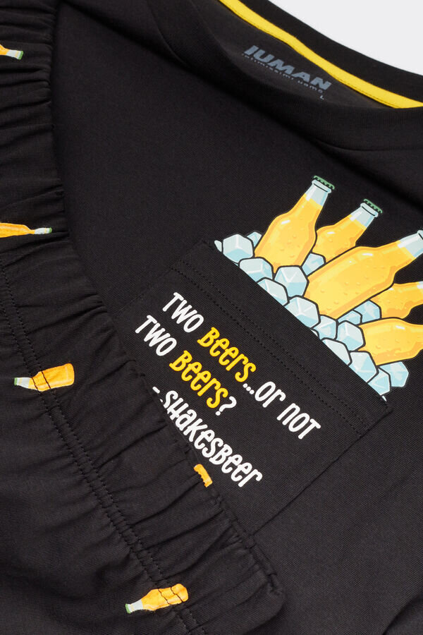 Kurze Pyjamas aus Baumwolljersey. Das einfarbige Shirt hat eine Tasche, die mit einem lustigen Text und einigen hervorstehenden Bierflaschen verziert ist. Die Shorts sind mit einem durchgehenden Bierflaschen-Print bedruckt.