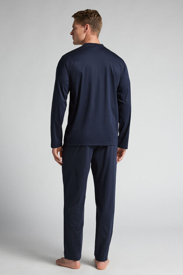 Langer Pyjama mit weichem, einfarbigem Hemd aus hochwertiger merzerisierter Baumwolle mit Tasche und Punktmuster. Die Hose ist ebenfalls mit Punktmuster bedruckt.