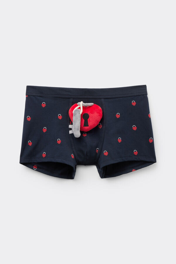 Herren-Boxershorts aus weicher, hochwertiger, leicht dehnbarer Baumwolle mit durchgehendem Padlock-Herz-Print. Ein romantisches Padlock-Herz mit einem Plüschtier in Form eines Schlüssels ist am Beutel befestigt.